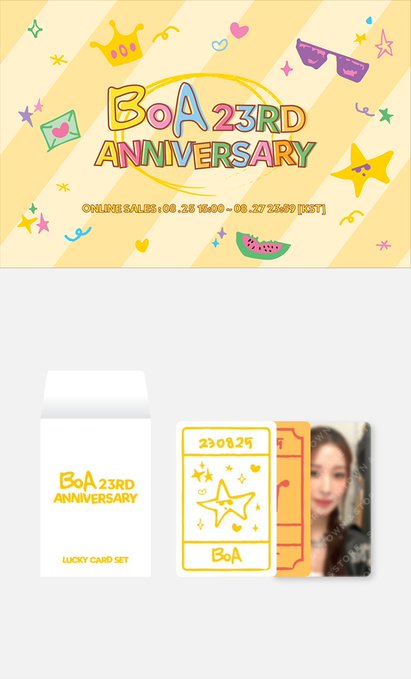 Buy [PREORDER] BoA 23rd Anniversary Lucky Card Set online today! [PREORDER] BoA 23rd Anniversary Lucky Card Set *Sales Period: 8/25 15:00 ~ 8/27 23:59 (KST) *Cancellations are only accepted during the sales period. *This product will be dispatched from 10/
